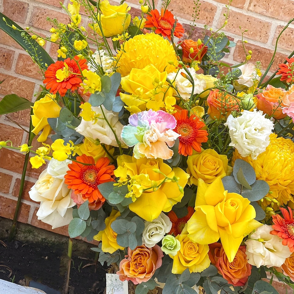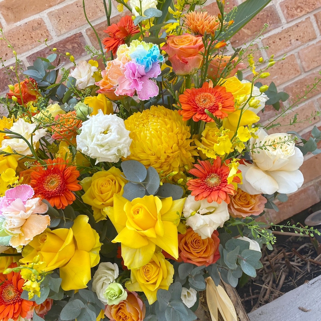 Sản phẩm gồm: Cúc mẫu đơn , hồng vàng halen , hồng victor , hồng cam spirit , lan vũ nữ , cẩm chướng cambodia , đồng tiền mini , hoa cát tường xoăn , hoa dơn lúa , lá dola và cỏ đồng tiền .