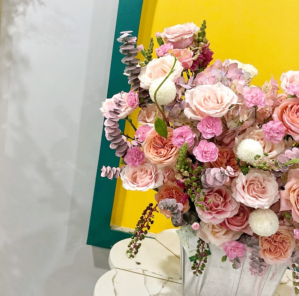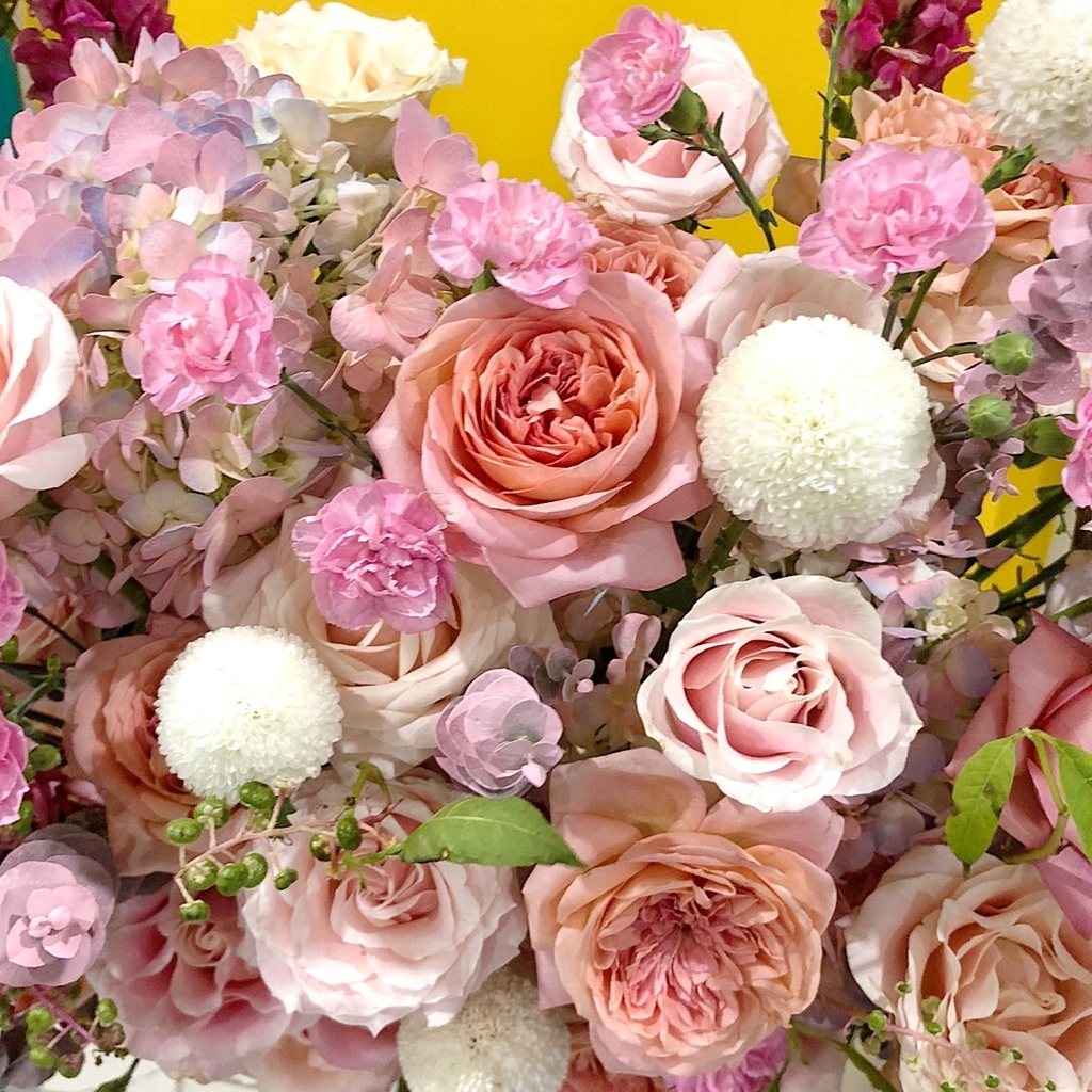 Sản phẩm gồm: Hồng juliet , cẩm tú cầu , hồng mondial , hồng sâm , cẩm chướng chùm , mõm sói , cúc pingpong và lá dola .
