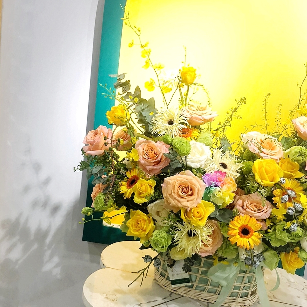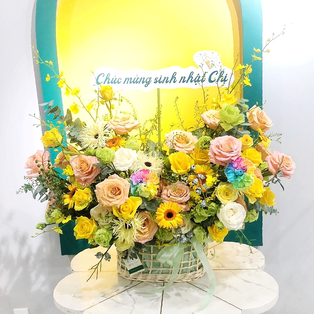 Sản phẩm gồm:Hồng shimmer , hồng vàng halen , lan vũ nữ , cát tường xanh , đồng tiền mini , cỏ đồng tiền , lá bạch đàn , quả omai , cẩm chướng combodia
